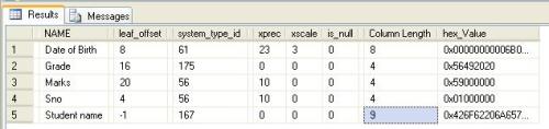 Now, we have the split of data as well,so we can find that which one column value is null or not by using Null Bytes. To achieve this convert Null Bytes (Hex value) into Binary format (As discussed, 1 indicates null for the column and 0 means there is some data).Here in this data, the Null Bitmap values are 00000111.We have only five column in student table (used as sample) and first five value of null bitmap is 00000.It means there is no null values.