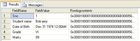 Select [RowLog Contents 0] FROM sys.fn_dblog(NULL,NULL)WHERE AllocUnitName =‘dbo.Student’ AND Context IN (‘LCX_MARK_AS_GHOST’, ‘LCX_HEAP’) AND Operation in (‘LOP_DELETE_ROWS’)
