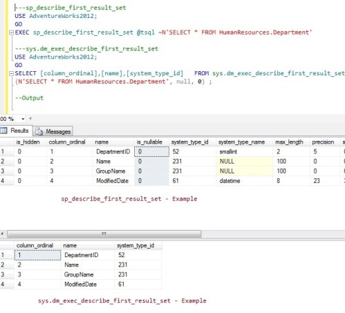 ---sp_describe_first_result_set USE AdventureWorks2012; GO EXEC sp_describe_first_result_set @tsql =N'SELECT * FROM HumanResources.Department' ---sys.dm_exec_describe_first_result_set USE AdventureWorks2012; GO SELECT [column_ordinal],[name],[system_type_id] FROM sys.dm_exec_describe_first_result_set (N'SELECT * FROM HumanResources.Department', null, 0) ; --Output