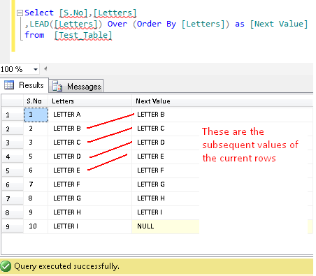 Select [S.No],[Letters] ,LEAD([Letters]) Over (Order By [Letters]) as [Next Value] from [Test_Table]