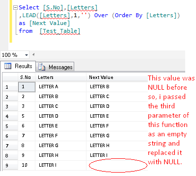 In the above example, you can view that if LEAD could not find the value it gives you NULL. In order to avoid NULL, you can pass the third parameter and it will be replaced by NULL.