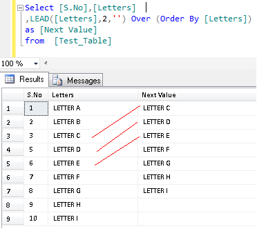 Select [S.No],[Letters] ,LEAD([Letters],2,'') Over (Order By [Letters]) as [Next Value] from [Test_Table]