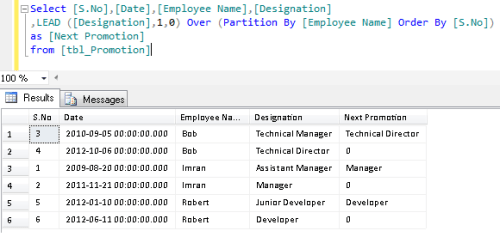 Use tempdb Create table [tbl_Promotion] ( [S.No] int, [Date] datetime, [Employee Name] varchar(50), [Designation] varchar(50) ) Insert into [tbl_Promotion] values(1,'2009-08-20','Imran','Assistant Manager') Insert into [tbl_Promotion] values(2,'2011-11-21','Imran','Manager') Insert into [tbl_Promotion] values(3,'2010-09-05','Bob','Technical Manager') Insert into [tbl_Promotion] values(4,'2012-10-06','Bob','Technical Director') Insert into [tbl_Promotion] values(5,'2012-01-10','Robert','Junior Developer') Insert into [tbl_Promotion] values(6,'2012-06-11','Robert','Developer') GO Select * from [tbl_Promotion] GO Select [S.No],[Date],[Employee Name],[Designation] ,LEAD ([Designation],1,0) Over (Partition By [Employee Name] Order By [S.No]) as [Next Promotion] from [tbl_Promotion] Go Drop Table [tbl_Promotion]