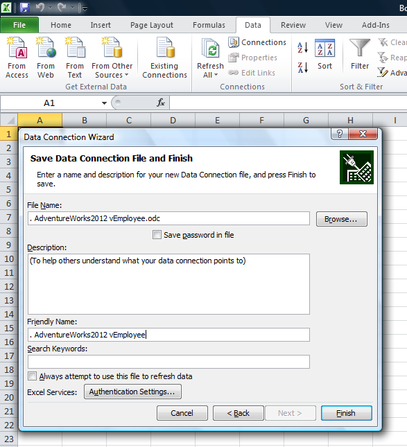 This is the last window of Data connection wizard, where you need to save the connection and click FINISH.