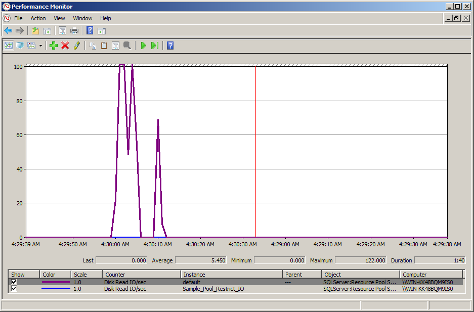 Now, we setup performance monitor to test the physical IO control feature via resource governor. Lets login with any user except the one created in step 3 and run the given below script and view the results in performance monitor. In my case, I logged in with sa and executed the script.