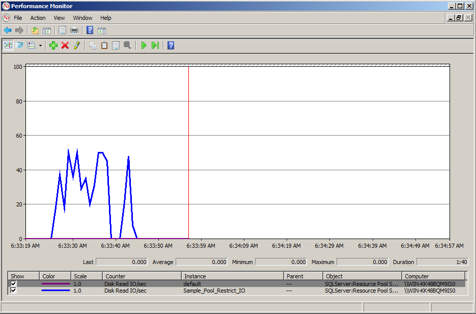 Now, we are ready to test the new feature (Control Physical IO). To test the feature, let’s open performance monitor, add counter and then select resource pool stats object, further select Disk read IO/sec and add default and custom Pool (Sample_Pool_Restrict_IO) created in step 1 and press ADD BUTTON as shown below.