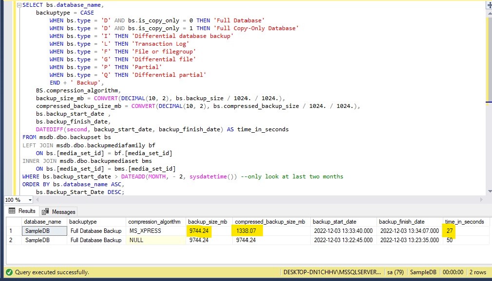 WHERE bs.backup_start_date > DATEADD(MONTH, - 2, sysdatetime()) --only look at last two months