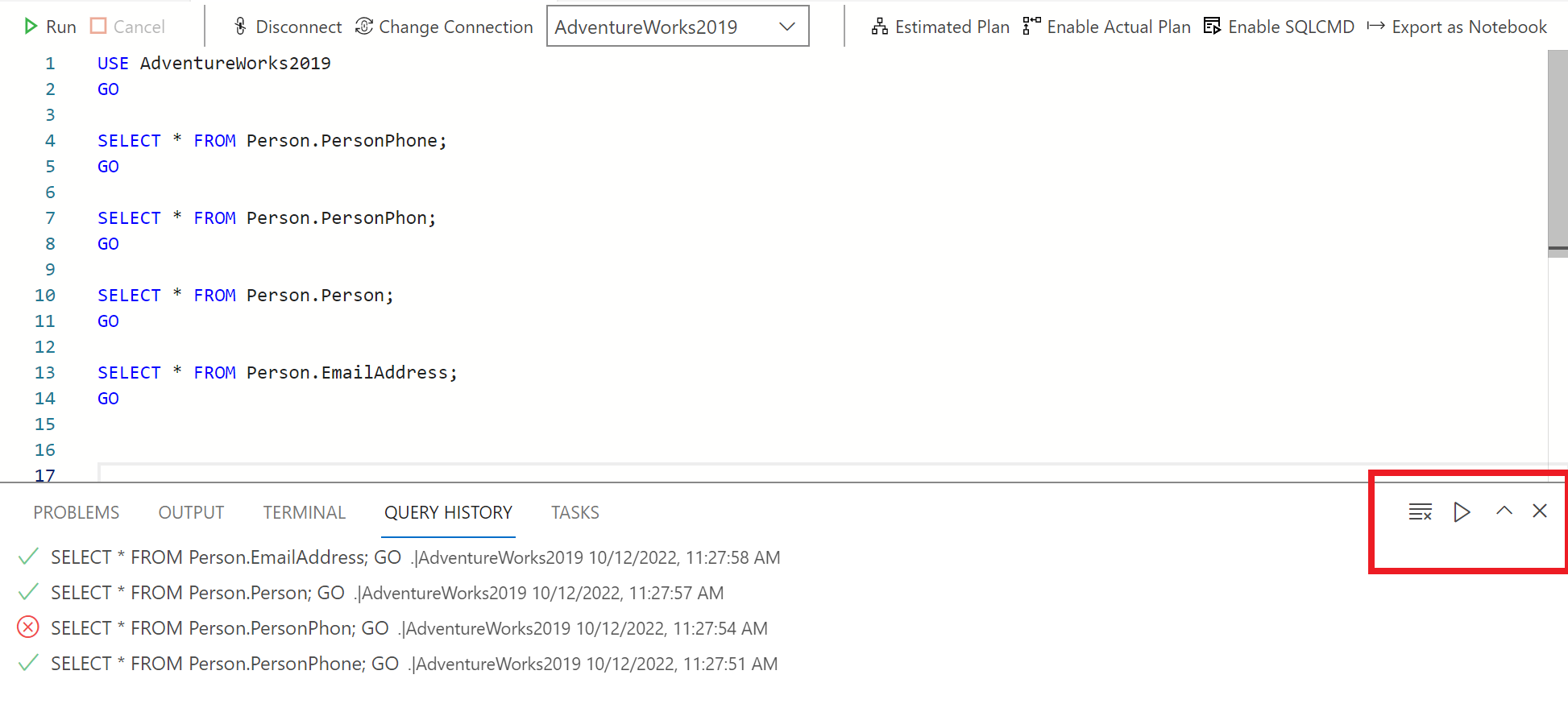 USE DevelopmentDB; GO --Adding salary column in Employee Table ALTER TABLE Employee ADD salary DECIMAL; GO --Adding Primary key in Employee Table ALTER TABLE Employee ADD PRIMARY KEY (EmployeeID); GO --Creating View using Employee Table CREATE VIEW vw_Employee AS SELECT EmployeeID, EmployeeName FROM Employee WHERE EmployeeName like 'dav%'; GO --Creating Procedure using Employee Table CREATE PROCEDURE sp_Employee_List AS SELECT Employee.EmployeeName FROM Employee WHERE Employee.BirthDate='1948-12-08'; GO --OUTPUT