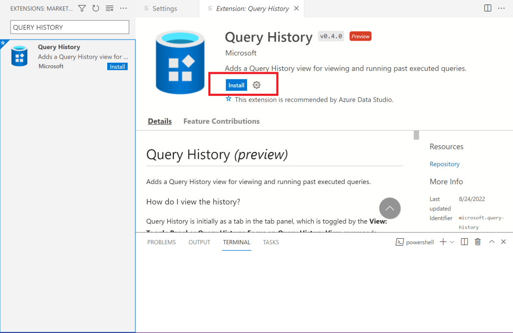 This will open Extensions Marketplace window where you can search SQL Server Schema Compare extension and install it by clicking Install button as shown below.