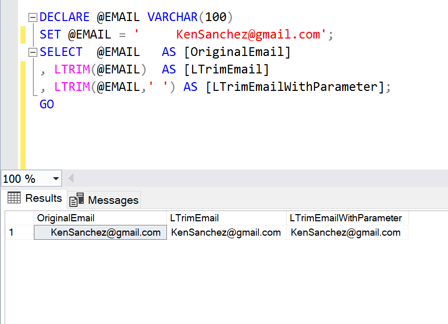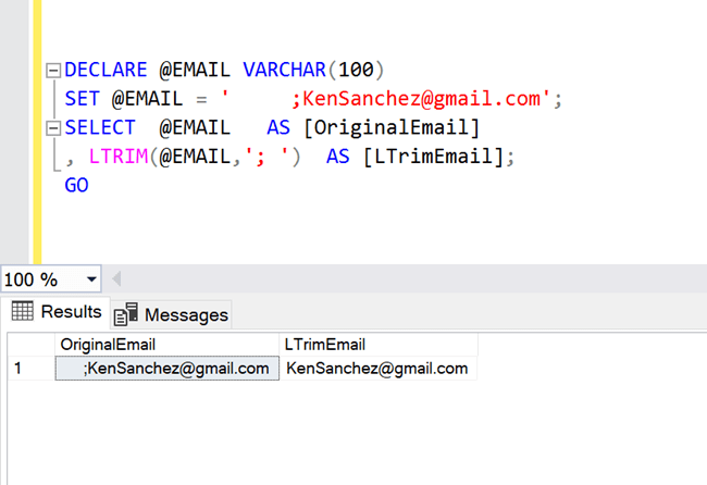 USE tempdb GO DECLARE @separator VARCHAR(1); SET @separator = ';'; SELECT EmployeeID , EmployeeName , EmailAddress , LTRIM(EmailAddress, @separator) AS EmailAfterLTrim FROM #Employees; GO
