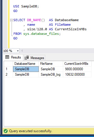 Let’s check the database file size by using sys.database_files and as you can see the database size is ~10 GB.