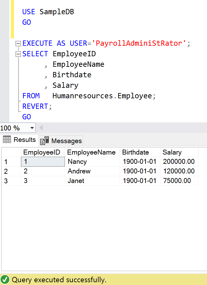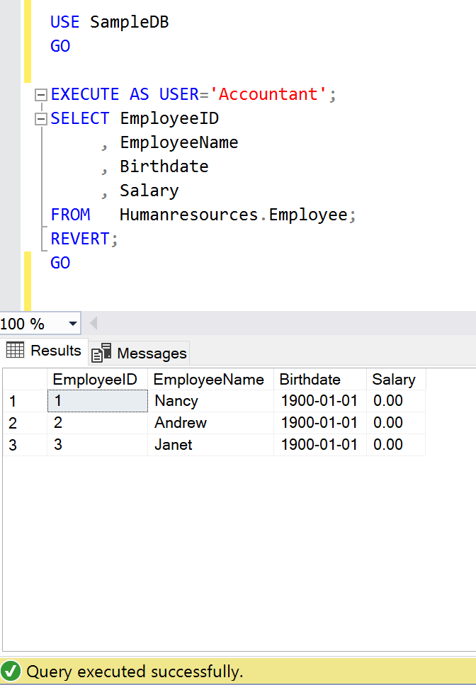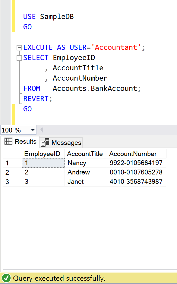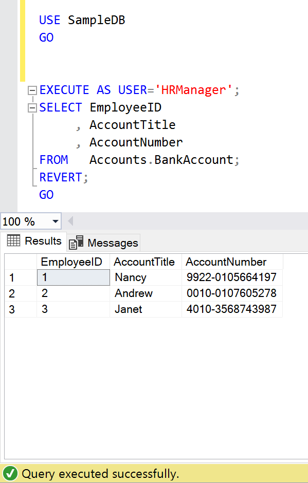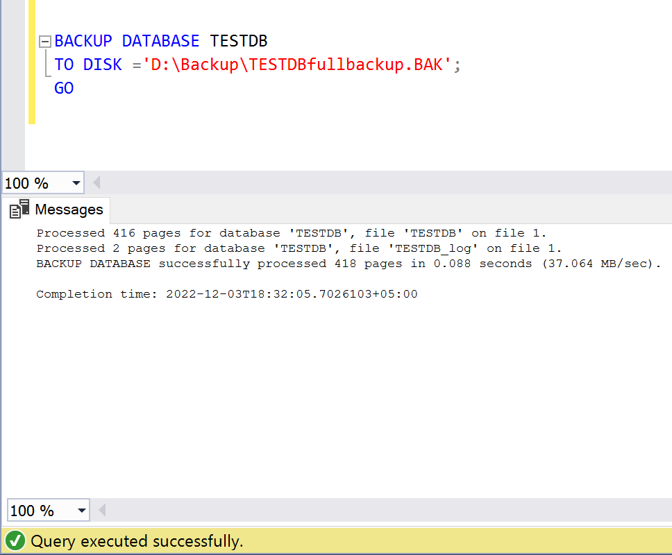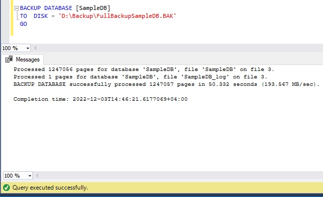 BACKUP DATABASE [SampleDB] TO DISK = N'D:\SampleDB_Backup.bak';
