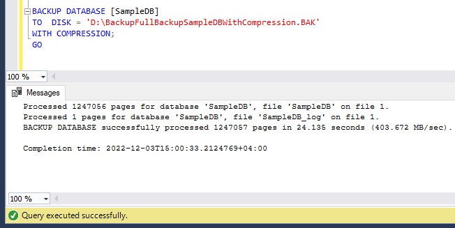 TO DISK = 'D:\BackupFullBackupSampleDBWithCompression.BAK'